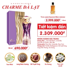 Mỗi lần nhắc về Đà Lạt, bất kỳ ai trong chúng ta đều dành cho nơi đây một tình cảm thật đặc biệt. Người ta yêu tất cả những gì thuộc về vùng đất này: thời tiết, cảnh vật và cả con người ở đây. Tựa như một cái ôm ân cần, Charme Đà Lạt khiến cảm xúc của bạn được vỗ về trong làn hương của Hoa Oải hương sâu lắng và sắc sảo, nhẹ nhàng cảm nhận từng cái chạm thật mềm mại và ái ân bằng hương hoa cam bay bổng.